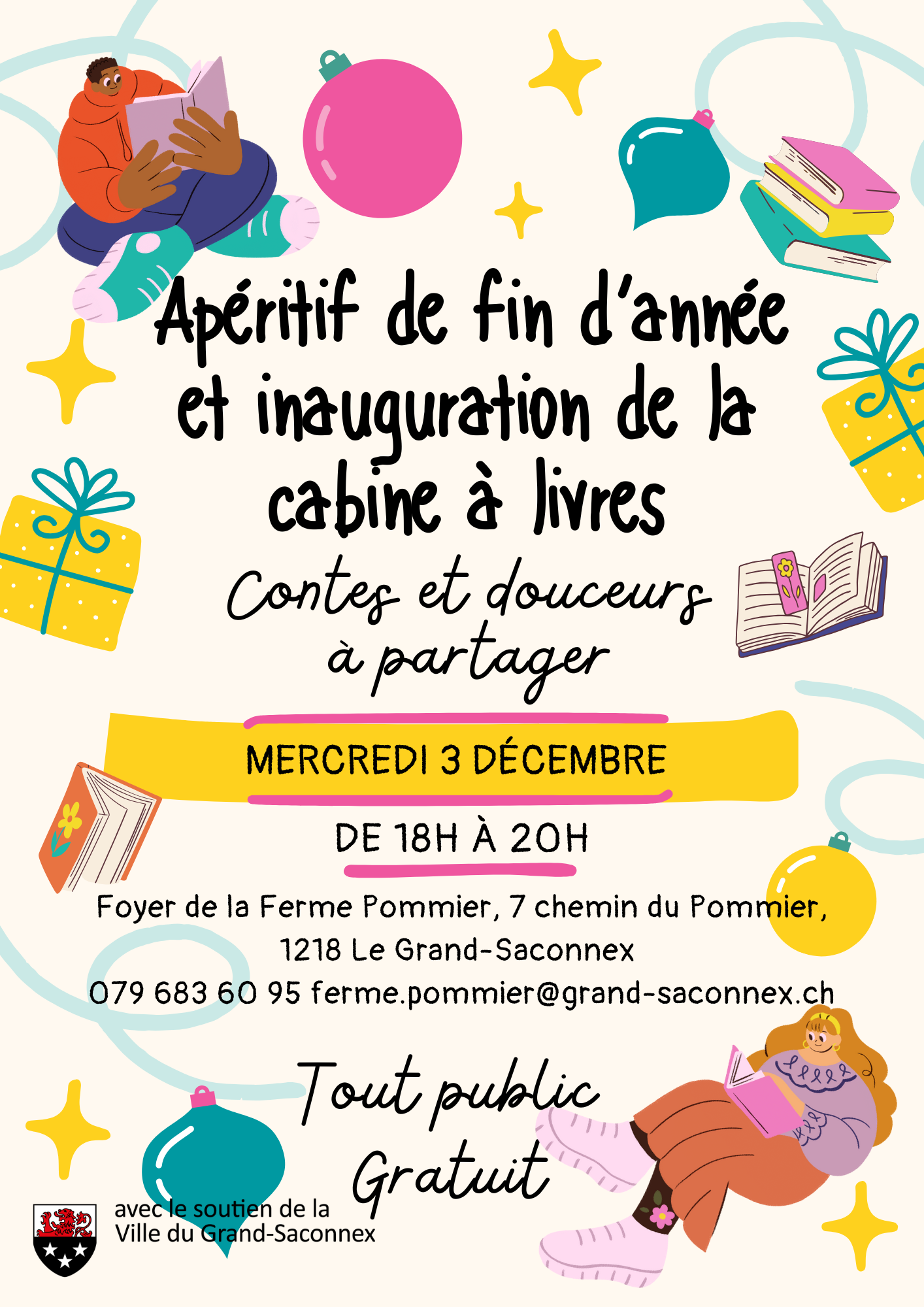Vous êtes toutes et tous les bienvenus à un apéritif de fin d’année, qui aura lieu le mercredi 3 décembre de 18h à 20h à la Ferme Pommier.